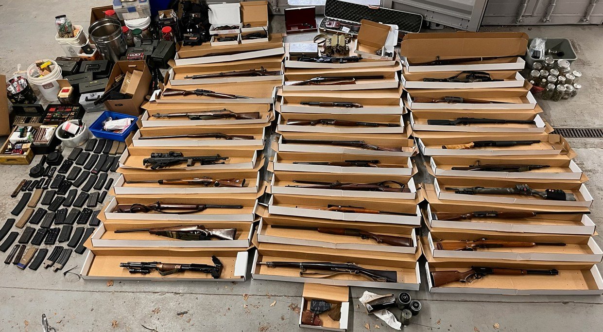 Police found a total of 39 firearms, five suppressors, 58 high-capacity magazines, three sets of body armor, and several thousand rounds of ammunition. They also recovered eight ounces of marijuana, alprazolam and methadone. Officers also found materials that they say is consistent with ammunition manufacturing and a large quantity of Tannerite.