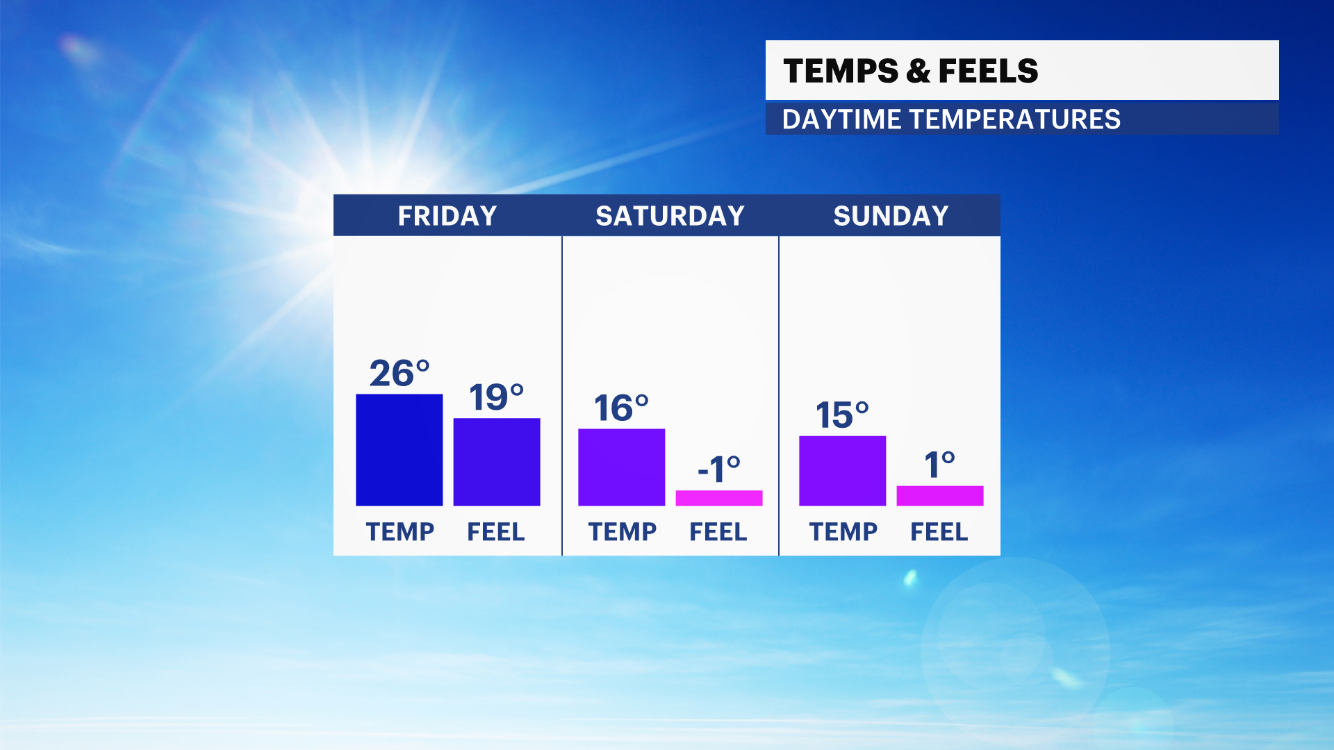 That's when we'll see high temperatures during the day only reach the middle teens, but it will feel like it's near zero. At night will be the worst part of this, overnight wind chills can fall as low as 15 to -25 degrees.