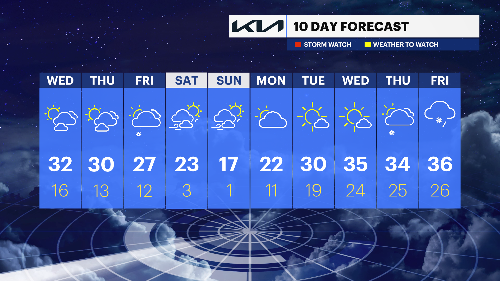 The next couple of days won't be too cold with highs near freezing, but we do dip into the danger zone again for the weekend. The cold temperature pattern isn't letting go for good. An Arctic front will deliver the colder air with winds that can gust 30-45+ mph. There is also a chance of seeing some snow Friday.